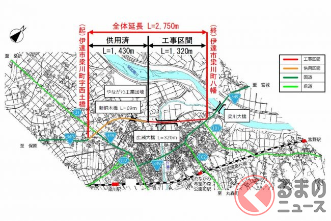 国道349号「梁川バイパス」23日全通! 広瀬川を渡って市街地通過が可能に