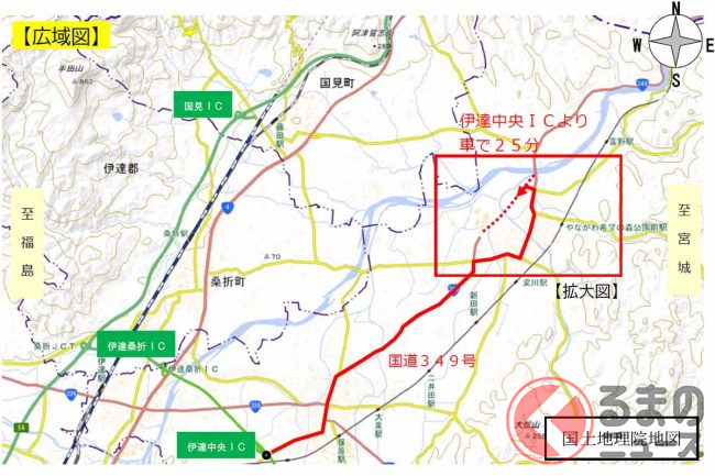 国道349号は茨城県水戸市から宮城県南部の柴田町までを南北に結ぶ全長約270kmの路線です。