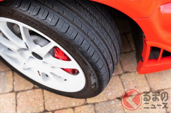 足元にはグロスホワイトに塗られた17インチのエンケイ・ラリアート・マルチスポーク・アロイホイールに、FULLRUN「F2000」が組み合わされ収まっています。ホイールの中には赤いブレンボ製のキャリパーが装着されています。