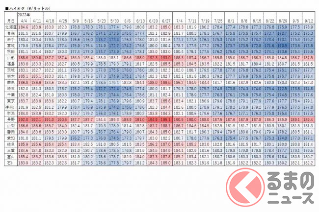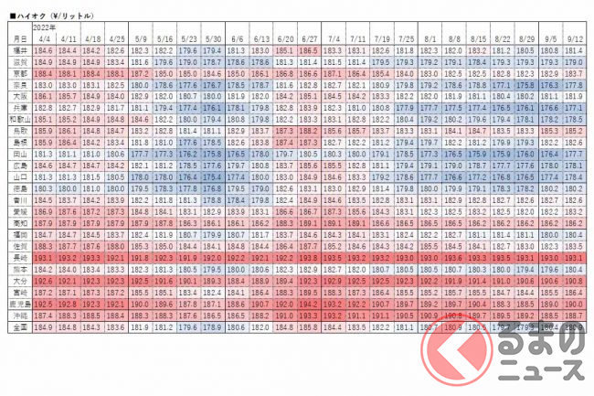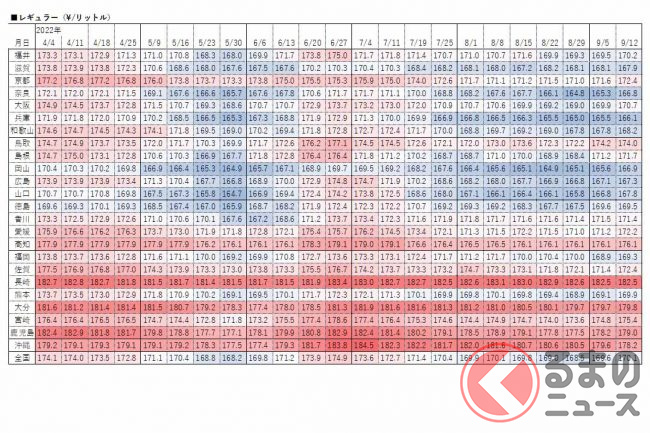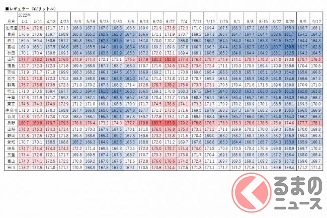 資源エネルギー庁は2022年9月14日、レギュラーガソリンの12日時点の店頭小売価格(消費税込)を発表しました。