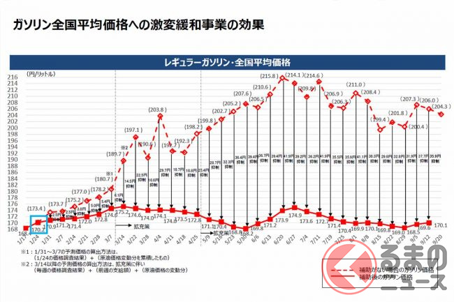 なお、経産省によると、補助金がない場合のレギュラーガソリンの全国平均小売価格は、9月12日時点で1リットル206.0円と算出しており、来週20日の時点で204.3円に推移すると見ています。