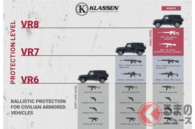 銃撃などに備え、防弾ガラスへの換装やアンダーパネル装甲などの追加、ドアヒンジの強化、サスペンションの強化など様々な改造がおこなわれており、その乗員保護レベルは、SVD(狙撃銃)の7.62mm弾丸にも耐えられるVR8レベルに達します。