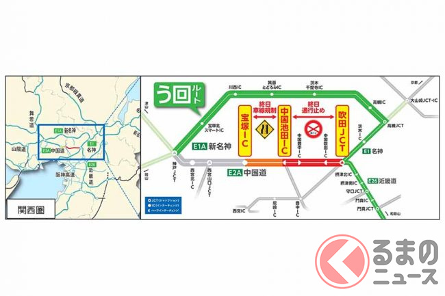 中国道で改修工事による通行規制が実施中。大阪では10月4日から40日間にわたり終日通行止めとなる予定です。