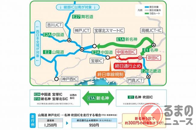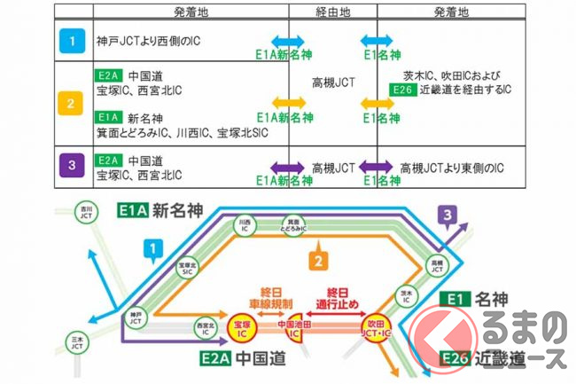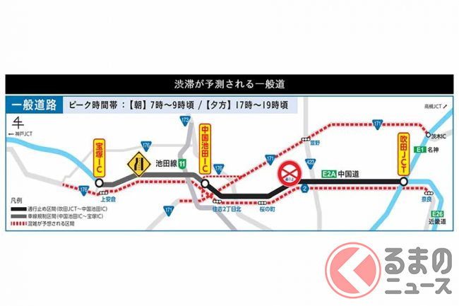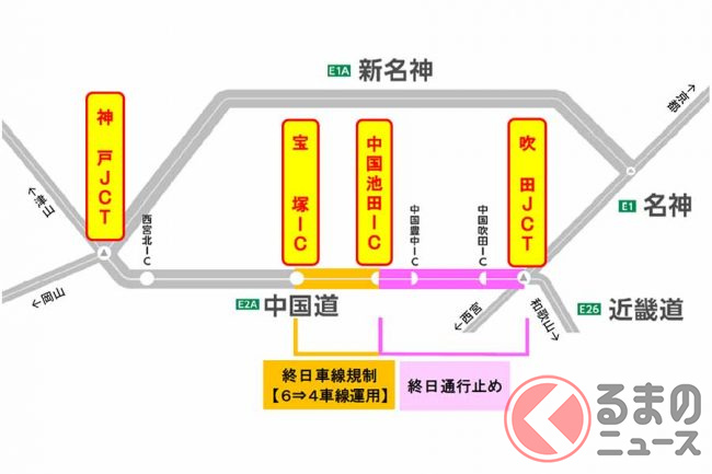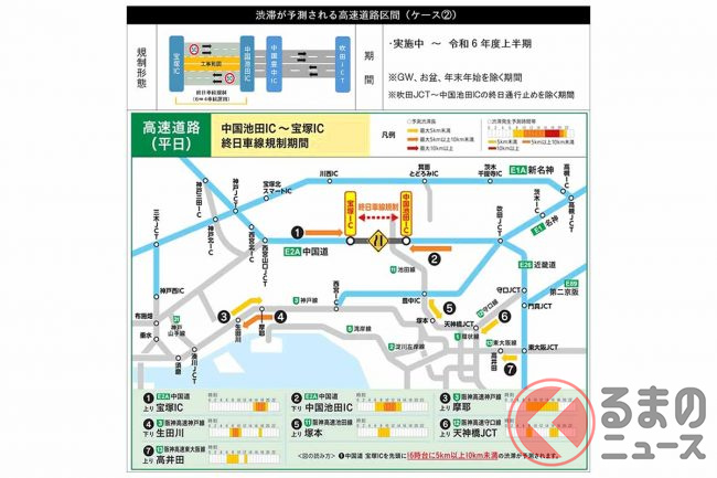 なお、隣り合う区間の中国池田IC~宝塚IC間は、終日の車線規制が2024年度上半期まで続きます。片側3車線が2車線(夜間は1車線の場合あり)に減っており、さらに車線の幅が縮小され最高速度が50km/hとなっているため、ここを走る際は速度や車間距離などに注意が必要です。