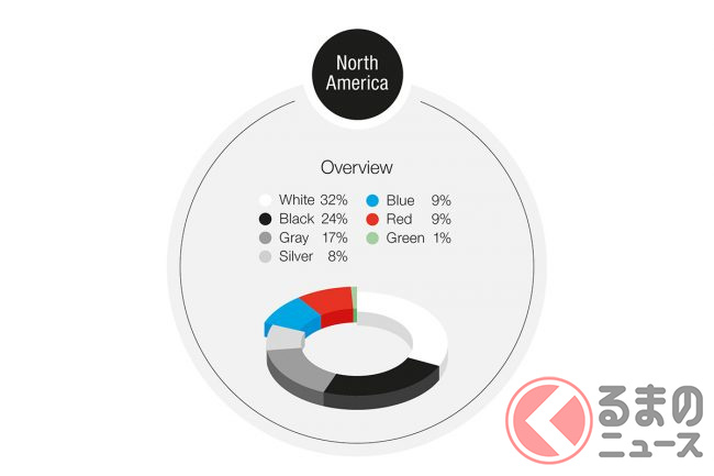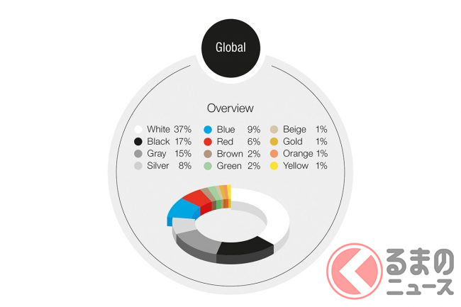 2022年1月発表の「BASF自動車用OEM塗料カラーレポート2021」によると、実際のボディカラーは白をはじめ黒・グレー・シルバーの無彩色が合わせて8割近くを占めているといいます。