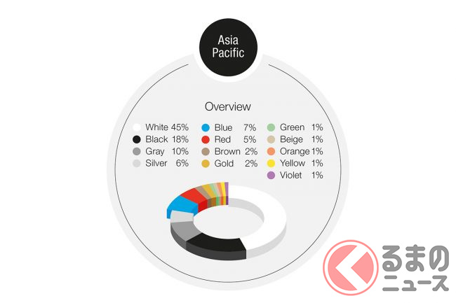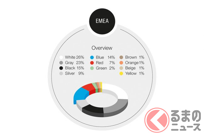 ただ、並行して青系や赤系が人気を伸ばしており、さらに世界各地で特定のカラー領域の人気がより鮮明になる傾向も見られるということです。