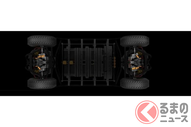 パワートレインには、最高出力604馬力、最大トルク737ft-lbを発揮するデュアルモーターが搭載され、4輪を駆動。オフロード走行時の最大航続距離は160kmで、充電切れを起こした際のバックアップ充電器が搭載されています。