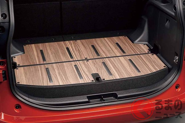 2列シート車の新型シエンタの荷室に装着可能な「ラゲージウッドデッキ」は、木目調のデザインで華やかな印象。水や泥汚れなどをサッと拭くことができるという実用性も持ち合わせています。