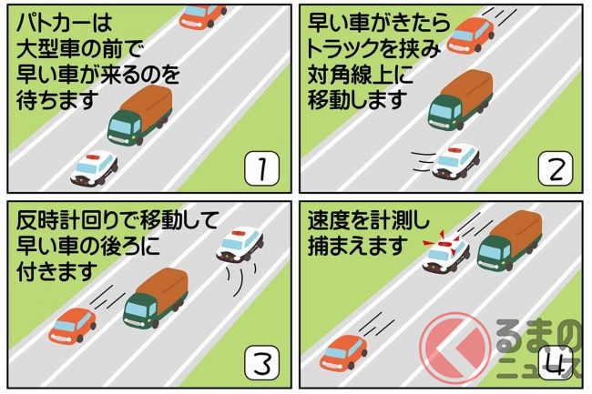 また、私が片側3車線の高速道路で見たのは、追越車線を飛ばしてくるクルマを白黒パトカーが取り締まる際、パトカーは中央車線を走る大型トラックを挟んで違反車からは死角となる対角線上を反時計回りに巧みに移動し、違反車の後ろに回り込むというプロの神業を見ました。違反車は白黒パトカーの姿に全く見ることなく、気が付いた時は速度を計測された後でした」