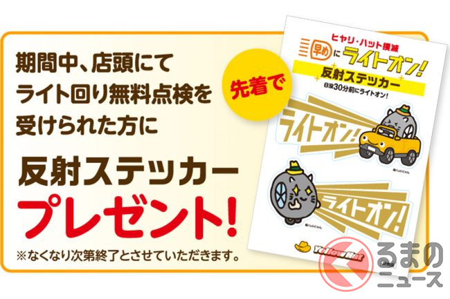 イエローハット店頭では、秋の交通安全運動期間中に、無料でヘッドライト、ブレーキライト、スモールライト、ウインカーの点検を実施します。点検を受けると、先着でキャンペーンステッカーがプレゼントされるということです。