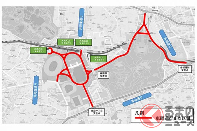 首都高4号新宿線の外苑出入口も、11時頃から21時頃まで利用できません。