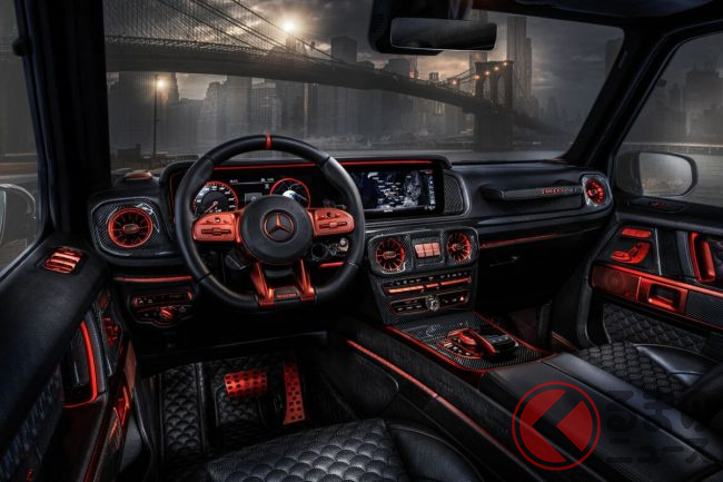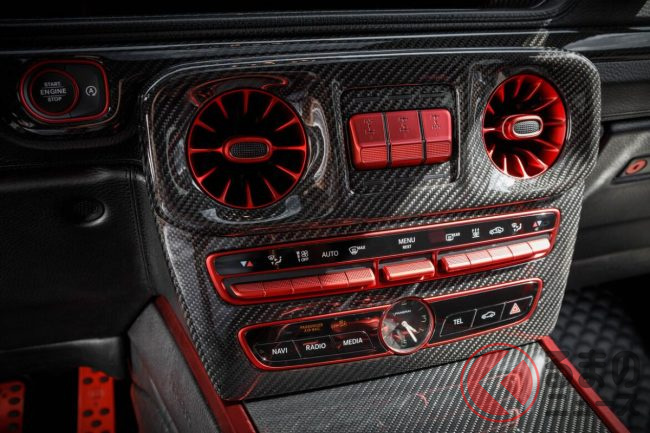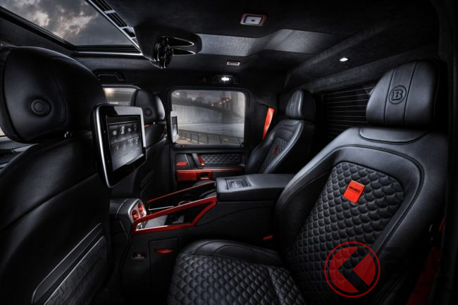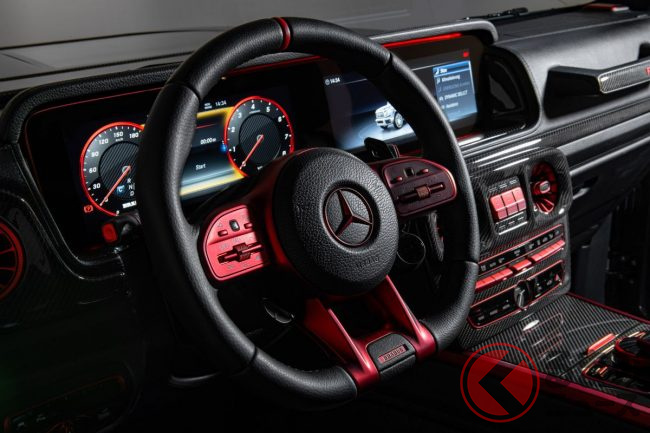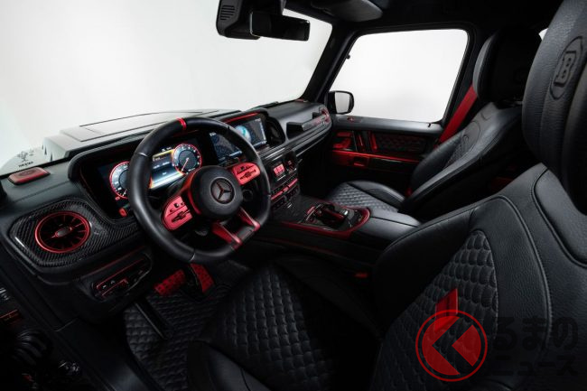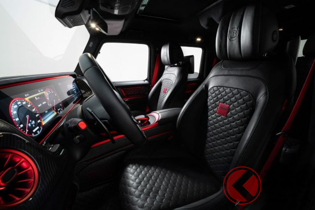 エクステリアは、「ロケットグレイ」に全塗装。標準の「Gクラス」と比べフレームは500mm延長されピックアップトラック化されているほか、カーボンファイバー製のBRABUSフロントフェイシアインサートやフロントスポイラー、「ロケットレッド」のサイドフラップ、カーボン製フロントグリルに組み込まれた「ロケットランチ」のアンビエンスライト、エンジンがボンネットを閉めていても見えるように窓が設けられたエンジンフードなど、25項目以上のカスタマイズがおこなわれ、攻撃的なスタイルを表現しています。
