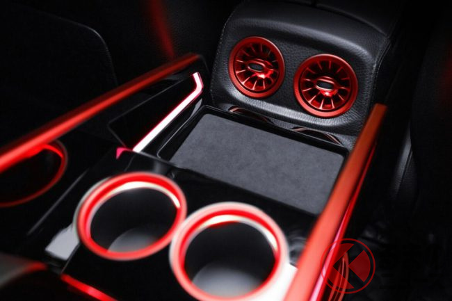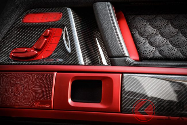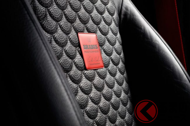 インテリアは、完全なハンドメイド。細部に至るまで磨き上げられたエレガントなツートーンレザーは、ブラックと「ロケットレッド」の組み合わせ。BRABUS特有の「シーシェルダイヤモンド」キルティングやシート、トリムパーツ、フットウェルにも最高級レザーが用いられています。