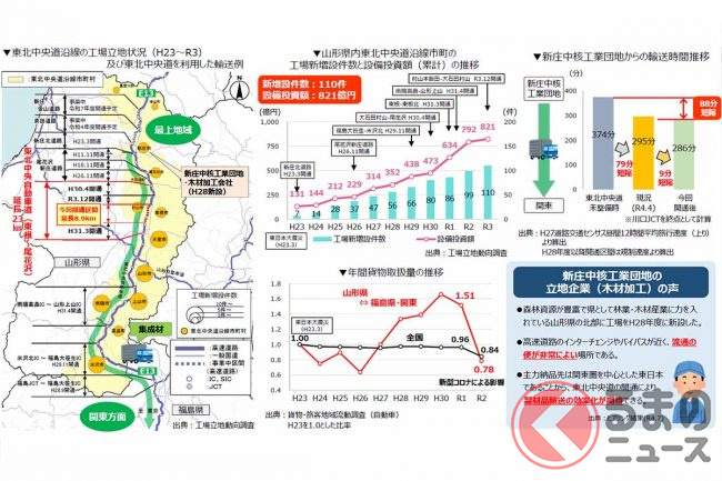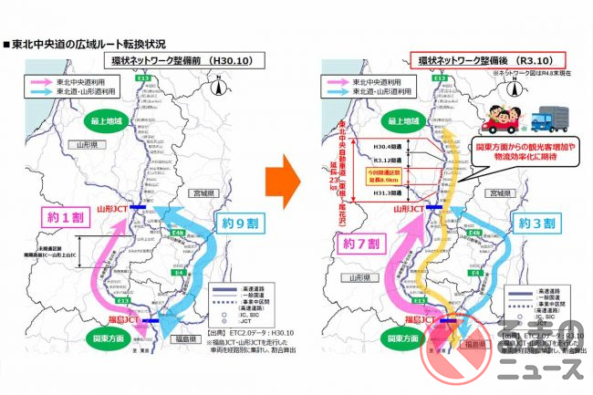 また、今回の開通で山形県の最上地域から関東方面まで高速道路でつながり、関東方面から山形県へ訪れる観光客の増加や、物流の効率化が図られるなど、山形県の経済面への波及効果も期待されるとしています。