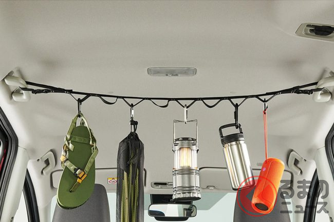 また後部座席のアシストグリップを利用して、用途に合わせてさまざまな物を掛けることができる「ハンギングベルトブラック」を利用することで、水筒やランプ、帽子などちょっとしたものを引っ掛けるのに便利。