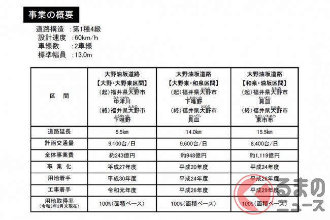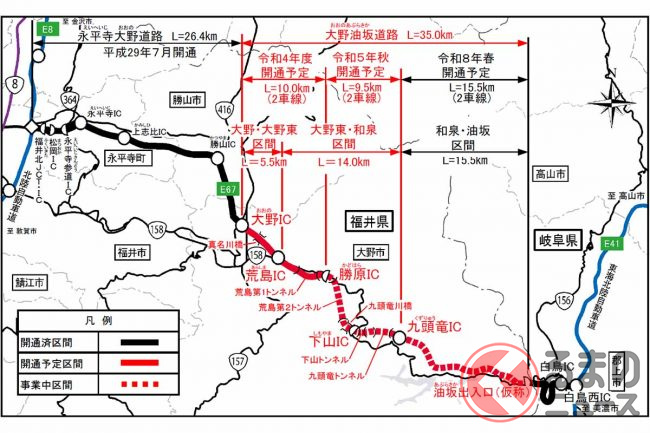 大野油坂道路の大野IC~勝原IC間10.0kmは2022年度、荒島第2トンネルを含む勝原IC~九頭竜IC間9.5kmは2023年秋、九頭竜IC~油坂出入口(仮称)間15.5kmは2026年春にそれぞれ開通する見込みです。