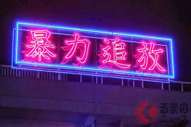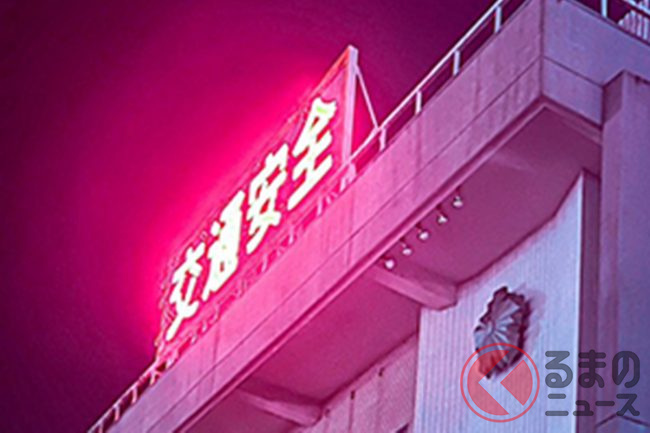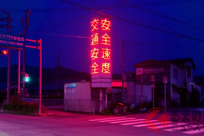 写真には交差点が映っておりそこにもネオン看板が。看板には「交通安全 安全速度」と赤文字で書かれていることが分かります。