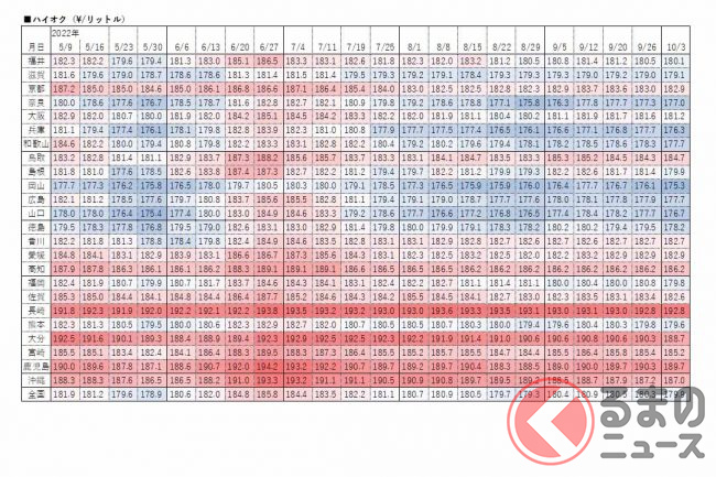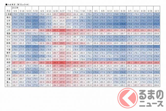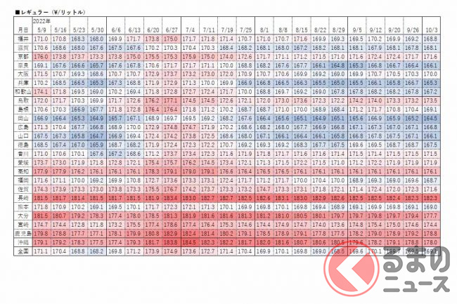 資源エネルギー庁は2022年10月5日、レギュラーガソリンの3日時点の店頭小売価格(消費税込)を発表しました。