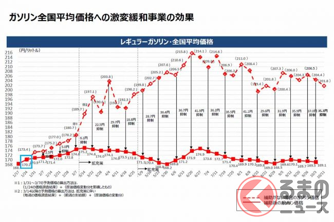 レギュラー平均169.1円! ガソリン3週連続で値下がりするも、補助金なしだと200円超で推移