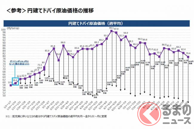 ガソリン価格の高騰を受け、政府は石油元売り企業に補助金を出す価格抑制策を実施。ガソリン、軽油、灯油、重油を対象に2022年1月27日から1リットルあたり5円、3月10日から25円、4月26日から35円を上限に支給しており、さらにそれでもガソリン平均価格が1リットル170円を超過したら、その分の2分の1を支援すると発表しています。