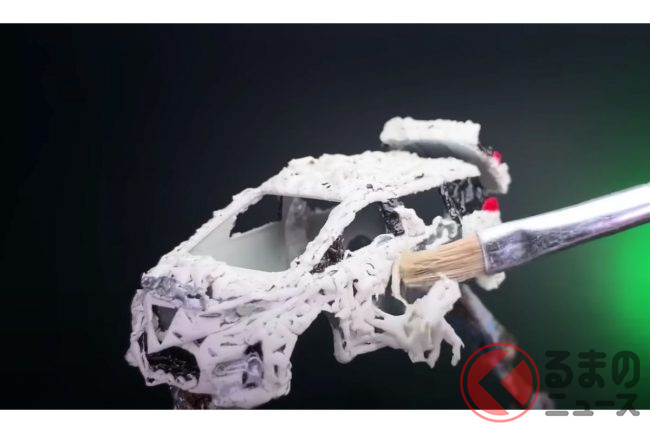 次にグリルやヘッドライトなどのパーツを外したうえでボディに剥離剤を塗り、塗装を剥がしていきます。