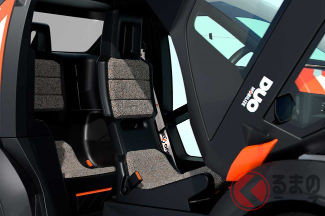 モビライズ デュオは新開発の小型EV。縦に2つのシートが並ぶ2人乗りとなっており、全長2430mm×全幅1300mm×全高1460mmとコンパクトな車体を持ちます。