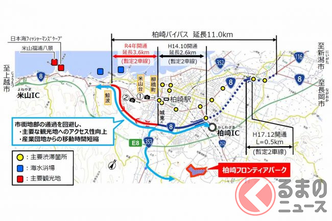 これにより、北陸道の柏崎ICに近い茨目から鯨波の現道(国道8号)までが1本につながり、鯨波海水浴場や米山福浦八景といった観光・レジャースポットへのアクセス性が向上します。
