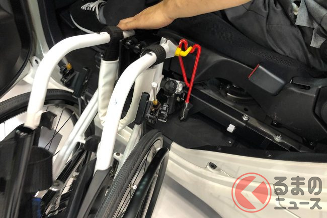 次に車いすをふたつ折りにしてたたみ、座席の左横にあるフックとつなぎ、座席の右横にある操作ボタンを押すと座席が運転席方向にスライドしていきます。その力を使って車いすを持ち上げて車内に搭載するという流れです。