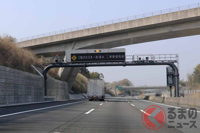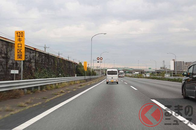区間内では、大きな速度差のある車両が混在して走るわけです。例えば新東名高速の最高速度120km/h区間は大型車の比率が高く、3車線あるうちの左側2車線は大型車のペースになり、追越車線に普通車が集まる傾向があります。