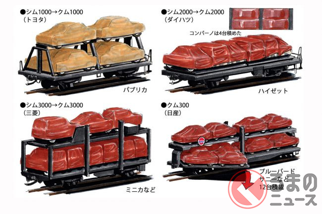 このほか、日産は「ブルーバード」を12台載せられる「ク300形」を、マツダは一般的な無蓋車「トラ30000形」を改造した貨車を、数両所有していました。