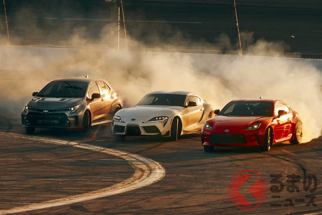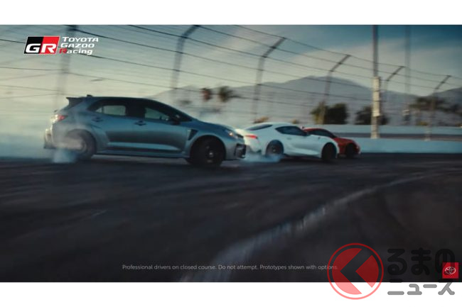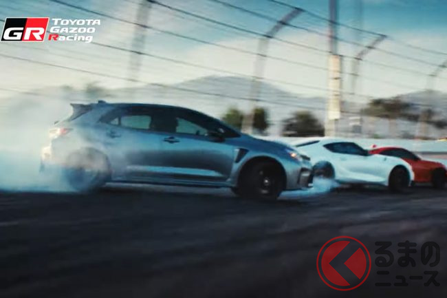 米国トヨタは、2022年10月17日に公式YouTubeチャンネルを更新。トヨタのスポーツカーブランド・GRモデルの「GRカローラ」「GRスープラ」「GR86」が3台並んでドリフト走行する動画をアップしています。