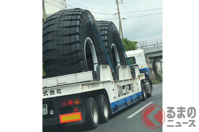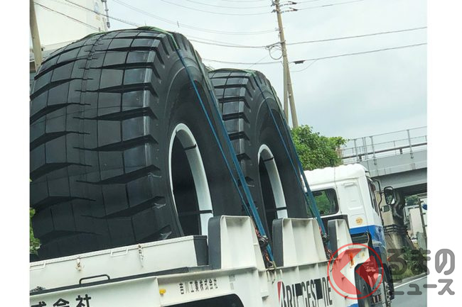 写真には、一般車とは異なる巨大なタイヤが2本、大型トレーラーの荷台部分に積まれている様子がうかがえます。走行するトレーラーのタイヤと比べてみても大きさは一目瞭然です。