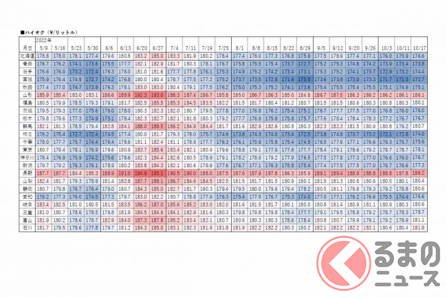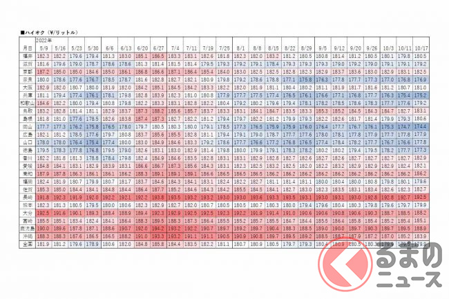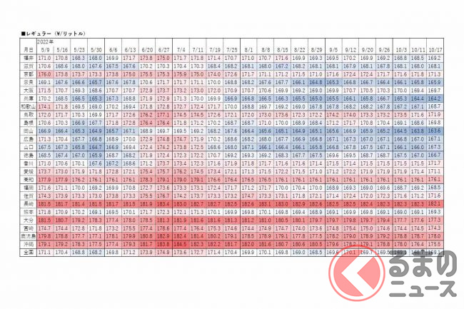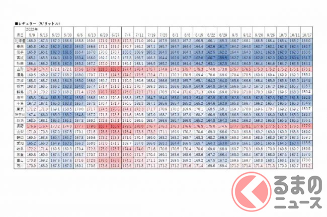 資源エネルギー庁は2022年10月19日、レギュラーガソリンの17日時点の店頭小売価格(消費税込)を発表しました。