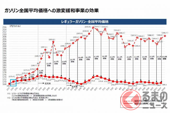 なお、経産省によると、補助金がない場合のレギュラーガソリンの全国平均小売価格は、10月17日時点で1リットル206.6円と算出しており、来週24日の時点で208.7円に推移すると見ています。