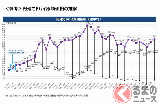 ガソリン価格の高騰を受け、政府は石油元売り企業に補助金を出す価格抑制策を実施。ガソリン、軽油、灯油、重油を対象に2022年1月27日から1リットルあたり5円、3月10日から25円、4月26日から35円を上限に支給しており、さらにそれでもガソリン1リットルの平均価格が170円を超過したら、その半分を支援すると発表しています。
