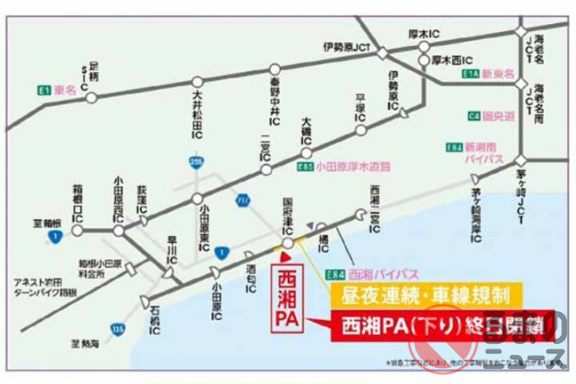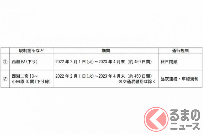 なお、西湘二宮IC~小田原IC間の下り本線で、PAランプの改良にあわせて実施されている昼夜連続の車線規制も、期間が「2023年4月末頃」までに延長されます。