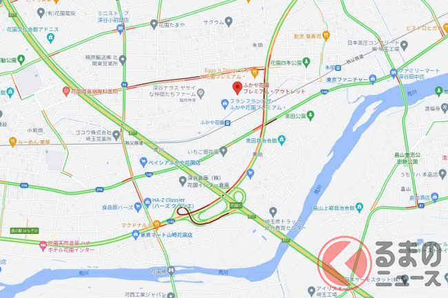 ふかや花園プレミアム・アウトレットは、関越道の花園ICから約1.5km北の場所にあります。19日は、商業施設に向かうとみられるクルマで花園IC出口は通過に2時間以上を要する混雑となり、渋滞は国道140号からICを介して関越道の本線まで延びました。