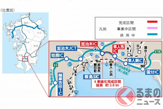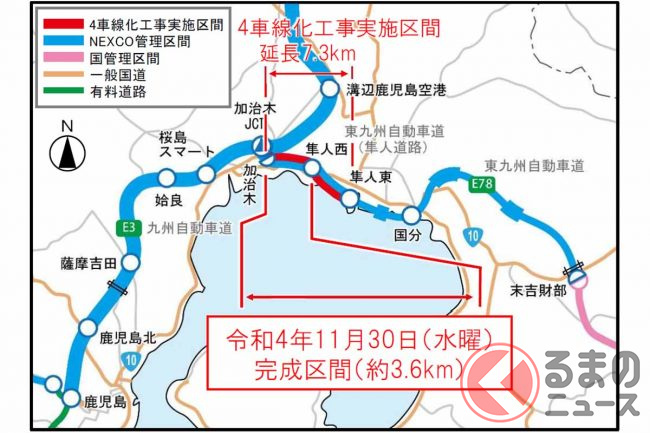 NEXCO西日本は2022年10月21日、東九州道の隼人西IC~加治木IC間3.6kmの4車線化工事が11月30日に完成すると発表しました。