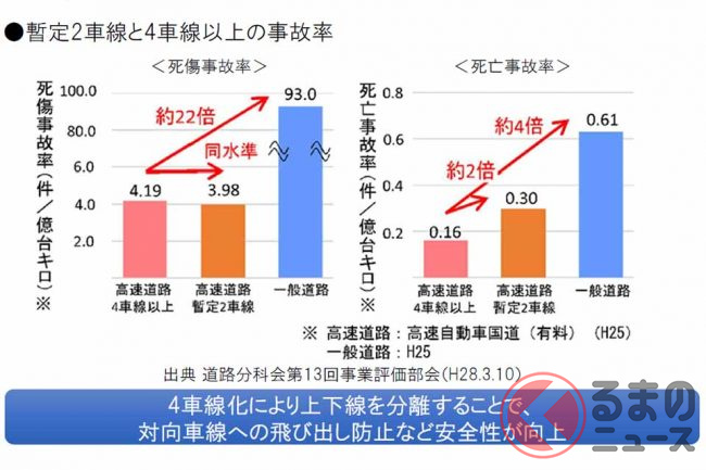 NEXCO西日本によると、4車線化により中央分離帯ができることで対向車線への飛び出しが防止され安全性が向上するといいます。