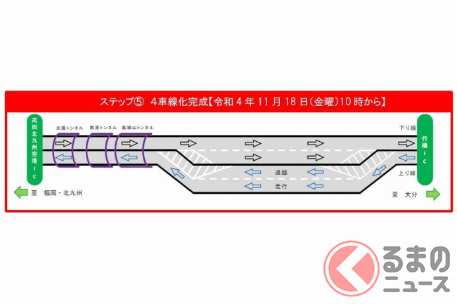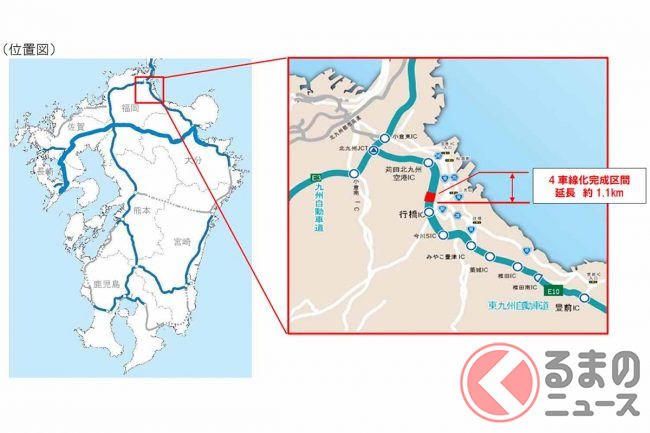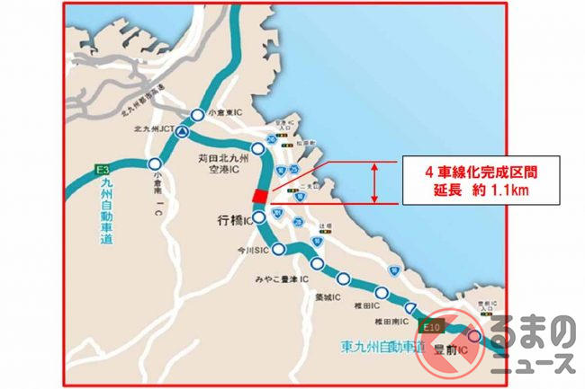 NEXCO西日本は2022年10月20日、東九州道の苅田北九州空港IC~行橋IC間の一部で進めていた4車線化工事が11月18日に完成すると発表しました。