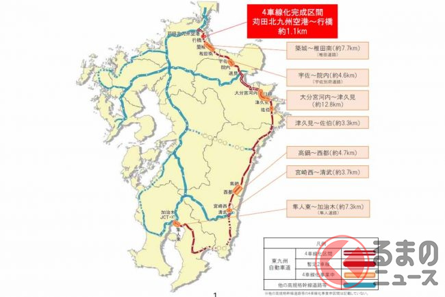 今回は約1.1kmが完成しますが、東九州道ではほかの7区間でも4車線化事業が進められています。