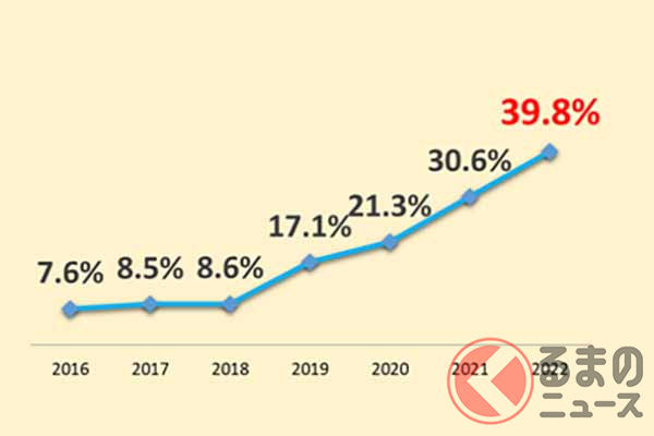 その結果、歩行者(JAF職員)が横断歩道を渡ろうとしている場面で一時停止したクルマは3003台で、割合にすると前年比9.2ポイント増の39.8%でした。