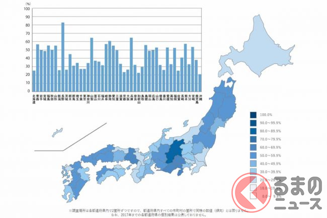 都道府県に見ると、一時停止するクルマの割合が高かったのは、トップが長野県82.9%、次いで兵庫県64.7%、山梨県64.6%でした。