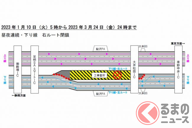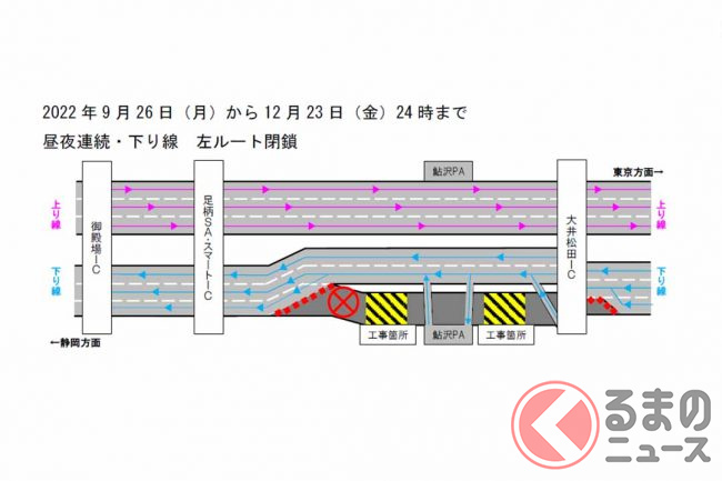NEXCO中日本は2022年10月25日、東名高速下りの大井松田IC~御殿場IC間で、長期間にわたり右ルートを閉鎖してリニューアル工事を行うと発表しました。