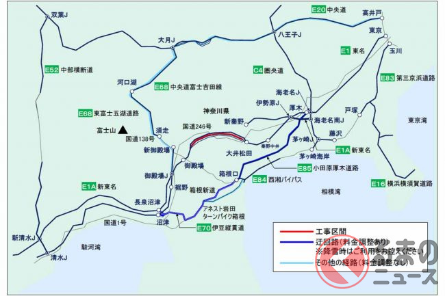NEXCO中日本は、小田原厚木道路・箱根新道への迂回や時差利用を呼び掛けるとともに、迂回路を利用したクルマに対しては、東名経由と通行料金が同額になるよう調整を行います(ETC車限定、諸条件あり)。