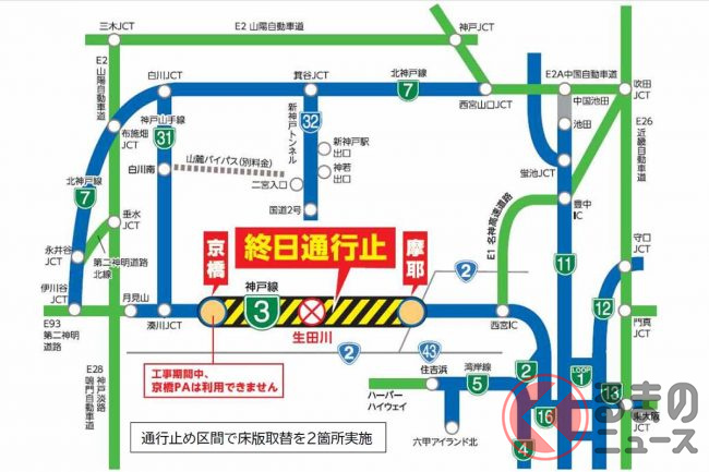 区間は、3号神戸線(上下線)の京橋~摩耶間約4.2kmです。京橋PAは閉鎖されます。