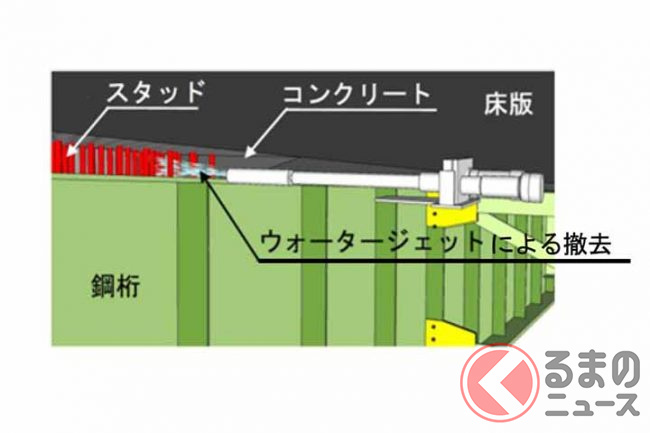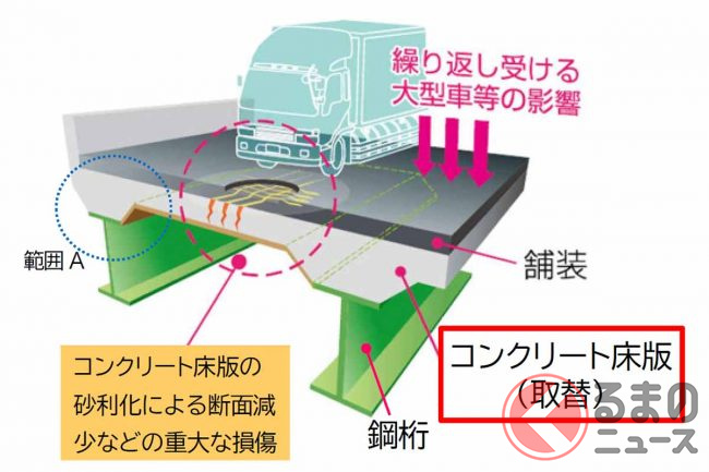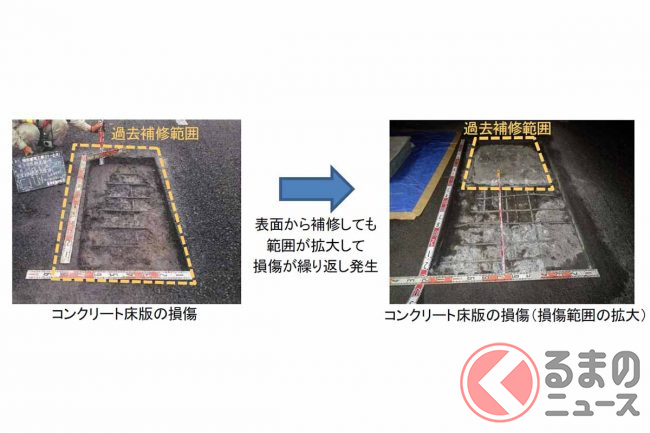 特に、一部のコンクリート床版は砂利化により薄くなるなど重大な損傷が進んでおり、表面から補修しても損傷が繰り返し発生する状況です。損傷がさらに進展すると、路面陥没などの致命的な損傷につながる恐れがあるため、抜本的な対策が必要としています。
