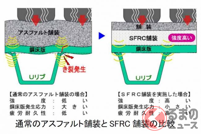 また、鋼床版を採用している区間では、既設のアスファルト舗装を剛性の高い鋼繊維補強コンクリート(SFRC:Steel Fiber Reinforced Concrete)に置き換え長期の耐久性を確保します。