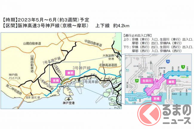 阪神高速3号神戸線で、2023年5月~6月にリニューアル工事を実施へ。これに伴い、およそ3週間の終日通行止めが計画されています。
