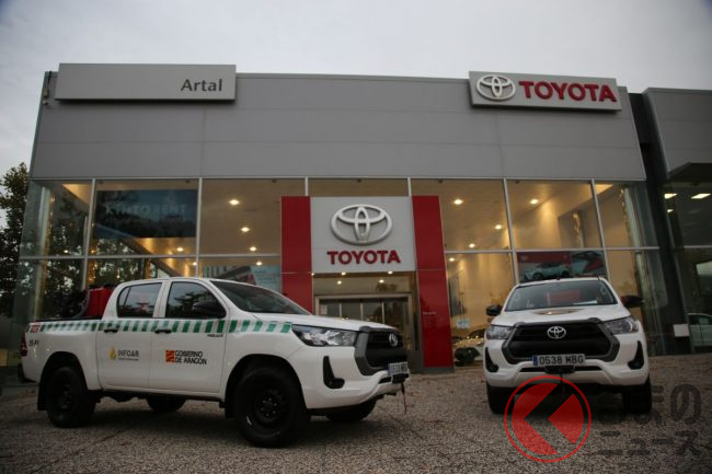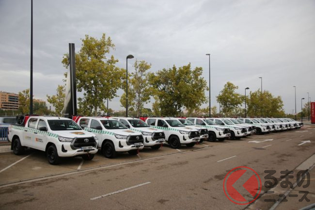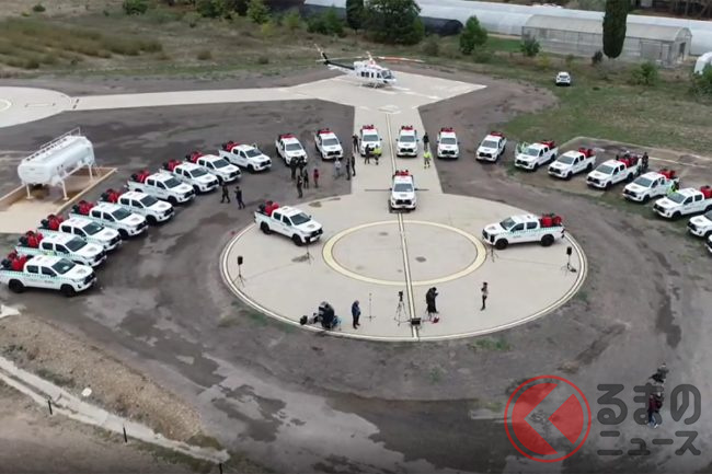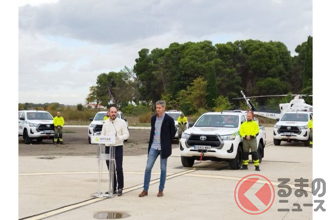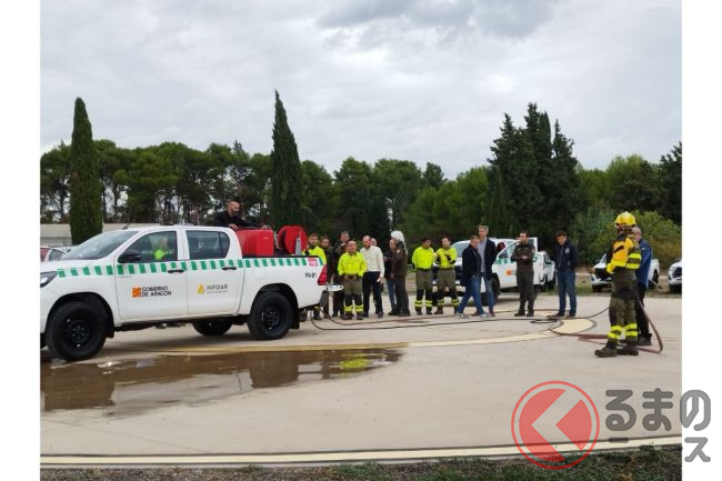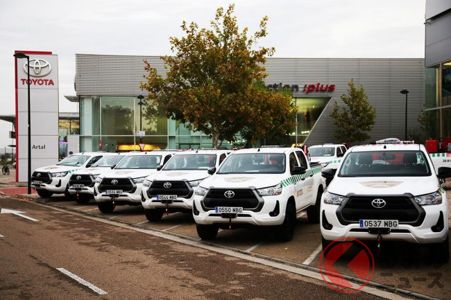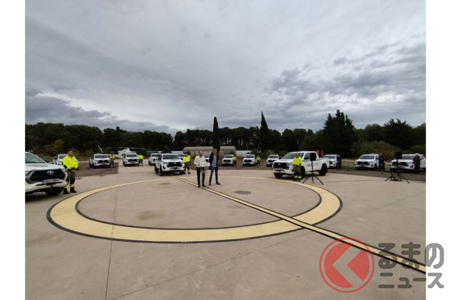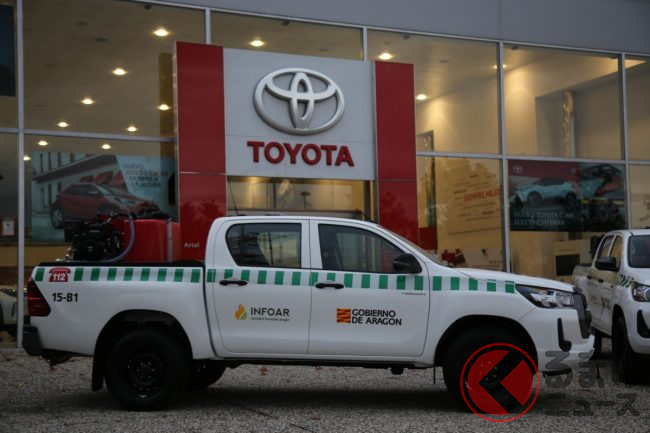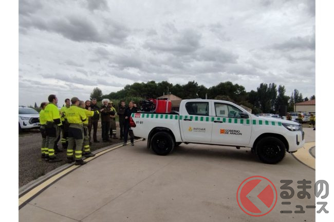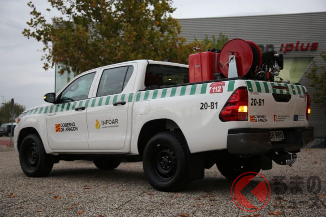 全部で何台あるのよ? トヨタ「ハイラックス消火車」の実車公開! 道なき道での火災&自然保護に対応!? 納車式をスペインで実施
